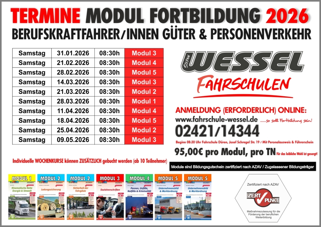 Die Fahrschule Wessel bietet eine breite Palette an Leistungen – von der Ausbildung in allen Führerscheinklassen über ASF- und FeS-Seminare, MPU-Vorbereitung, BKF-Schulungen und Fahrlehrerausbildung bis hin zu Kran- und Flurförderzeugausbildungen und vieles mehr.